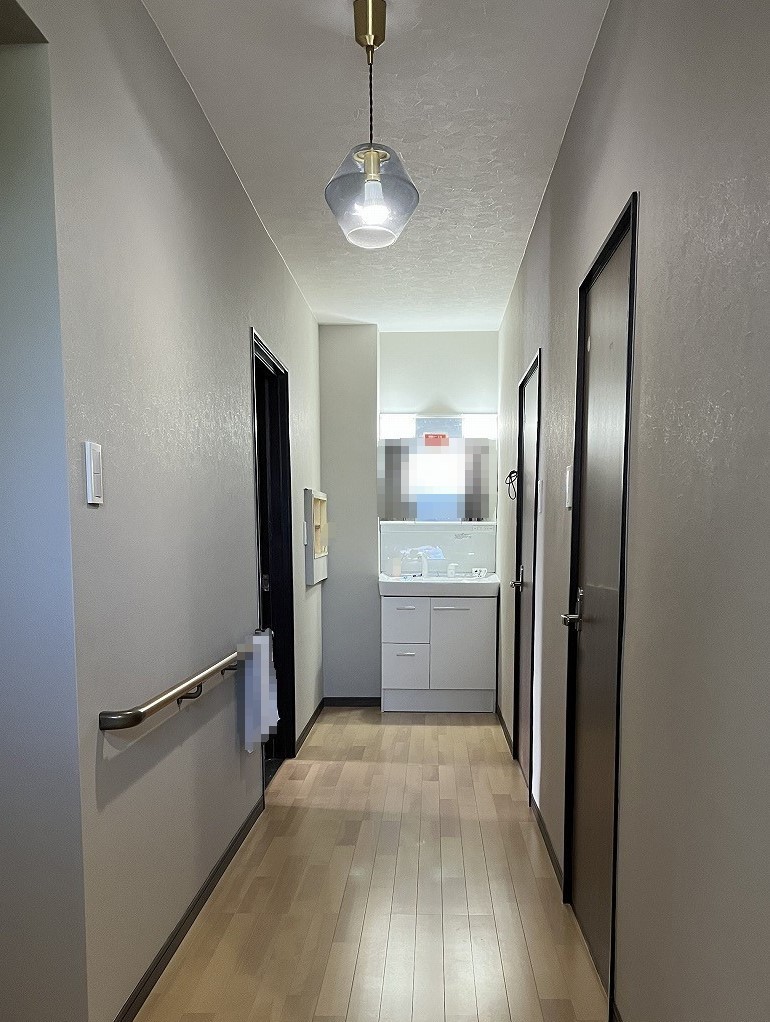 廊下と洗面所の内装工事をしました。 全体的に工事前と印象がかわり、とても素敵な印象になりました。 廊下の先の洗面所も綺麗になり、とても素敵です!