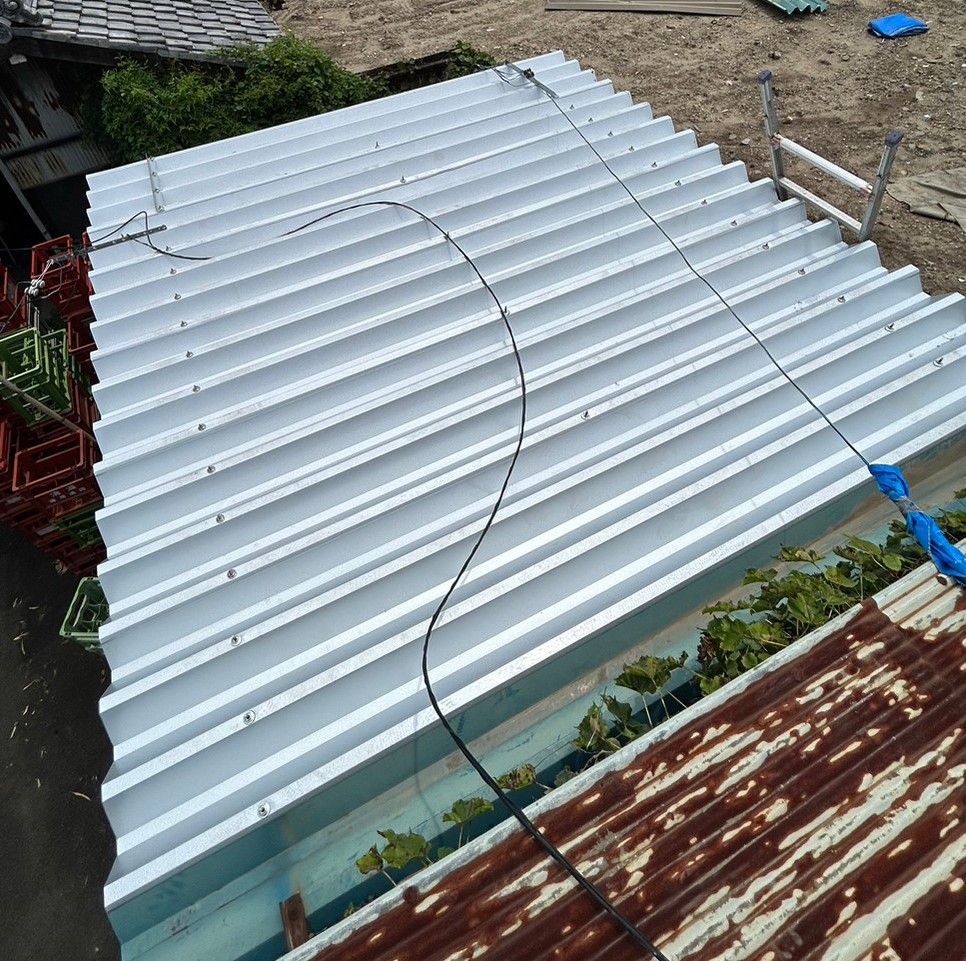 折板屋根取替工事をしました。 大きく凹んだ屋根を新しい屋根材に取替え、綺麗な折板屋根に変わりました。見た目も綺麗になり、スッキリした感じにみえます。