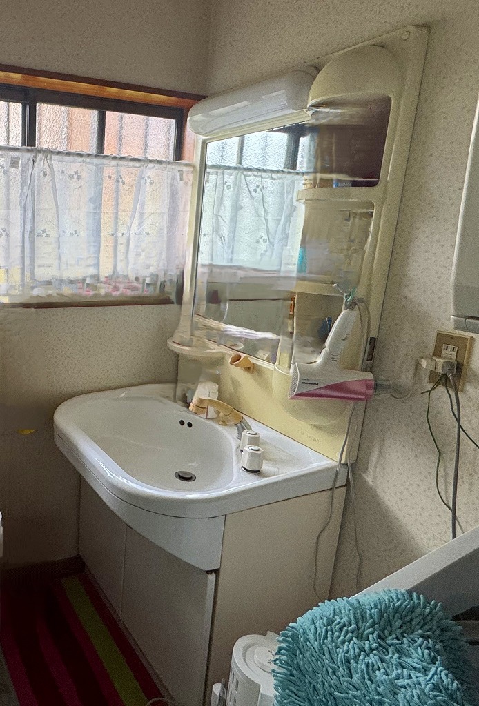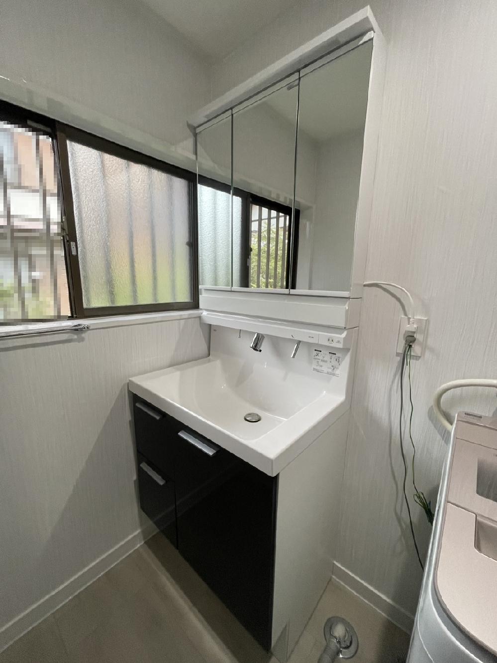 洗面化粧台の交換工事をしました。 鏡も大きくなり、中に収納することが出来るのでスッキリしますね。壁紙も張り替え、明るい洗面化粧台に生まれ変わりました!
