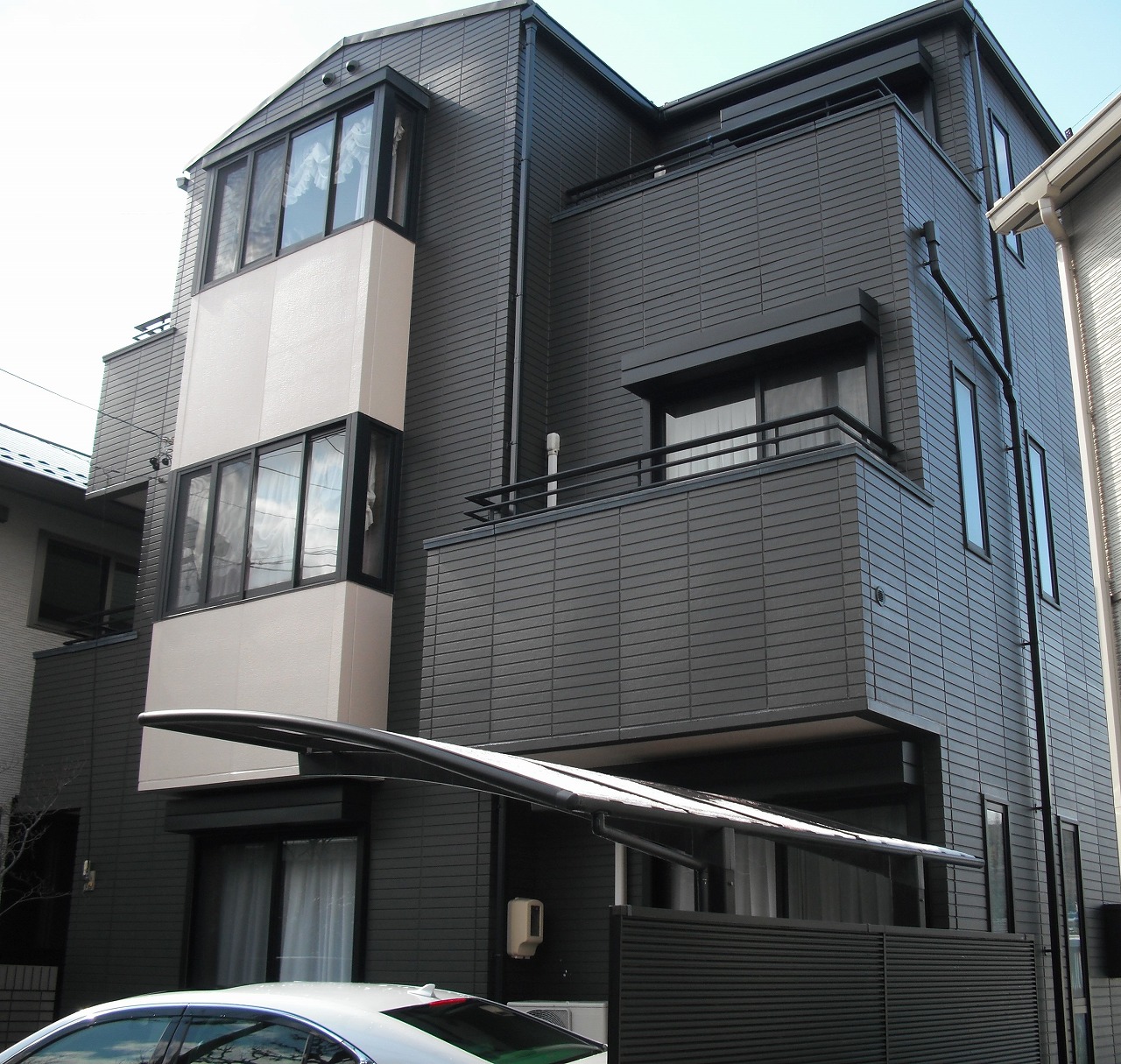 外壁塗装:フッ素塗料 全体を濃いお色に塗装し、更にオシャレな印象に仕上がりました!!