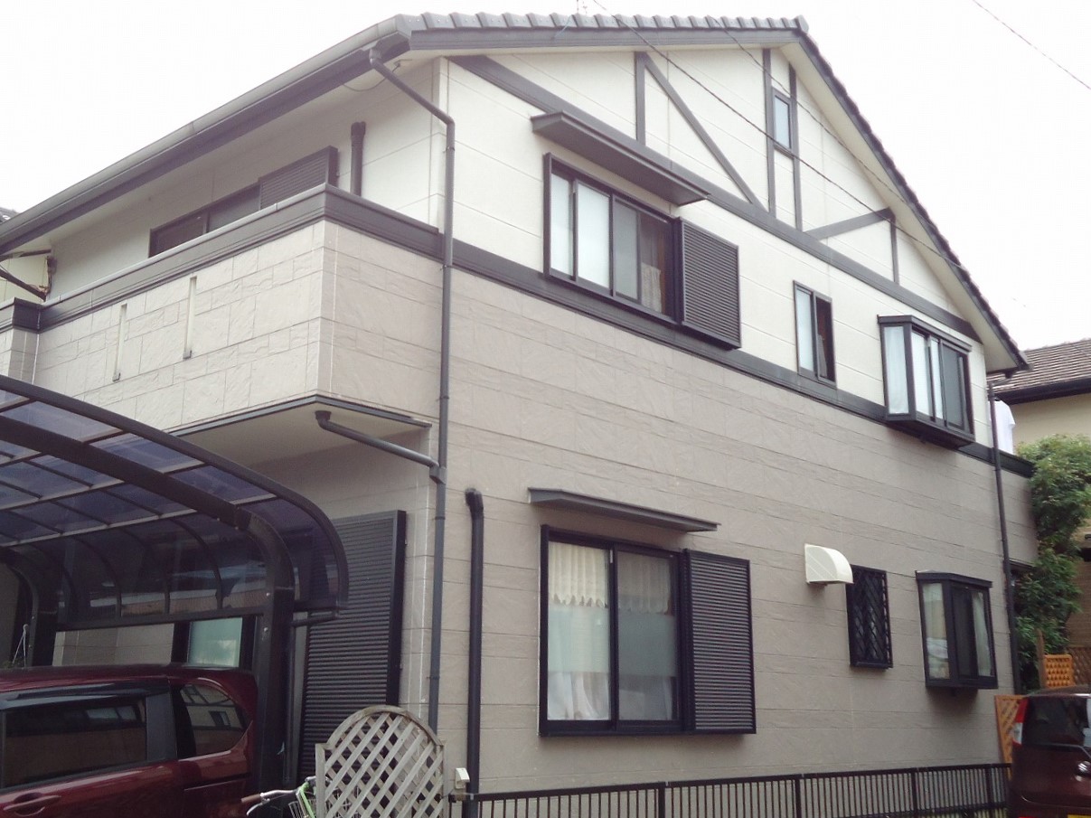 外壁塗装:フッ素塗料 1、2階のお色は既存の1階のお色に合わせ、ベランダのお色を暗いお色にしました。 正面から見た印象に変化があり、更に素敵なお家に仕上がりました!!