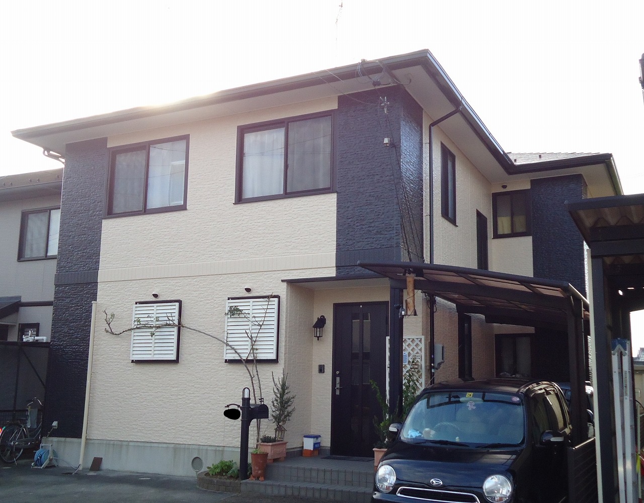外壁塗装:フッ素塗料 屋根塗装:シリコン塗料 ベランダと四つ角を暗いお色で塗装しました。 暗いお色がアクセントとなり、素敵なお家に仕上がりました!! 屋根も合わせて塗装しました。