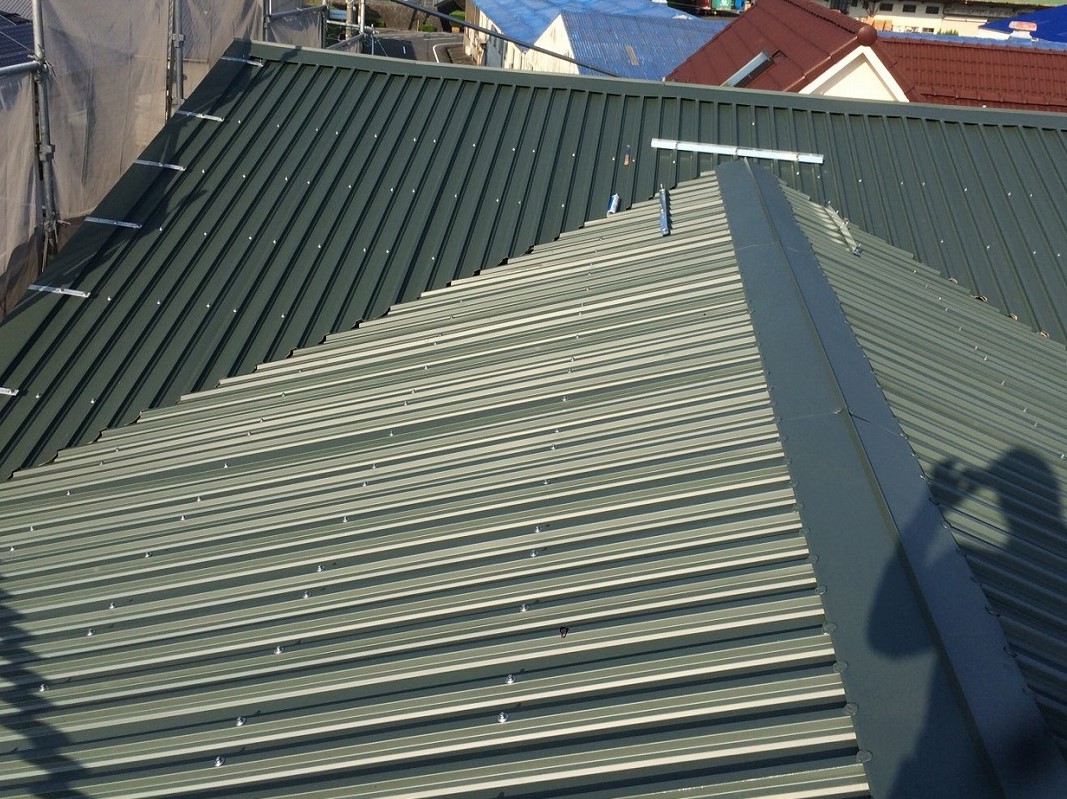 屋根板金:ソフレアルーフ(折半屋根) お色:モスグリーン 屋根の板金工事をして、屋根がスッキリとして綺麗になりました。 お色も落ち着いたお色でとてもいいと思います。
