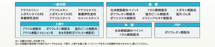 ・コンクリート、セメントモルタル、ALCパネル、スレート板、押出成形セメント板、サイディングボード、各種旧塗膜(活膜)など ・鉄部、亜鉛めっき鋼、アルミニウム、ステンレスなどの金属
